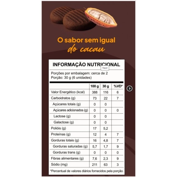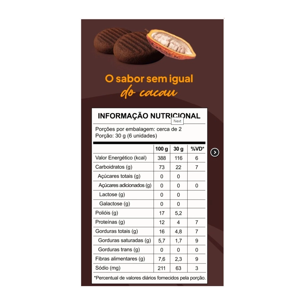 CATEGORIA ALIMENTAR>SEM GLÚTEN>Biscoito Doce de Cacau Zero Proteico - ARUBA - 50g
