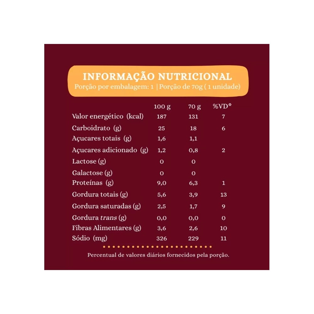 Amido modificado de mandioca, farinha de tremoço, gordura vegetal, açúcar demerara, sal, fibra vegetal de psyllium, estabilizantes hidroxipropilmetilcelulose e goma xantana, conservadores propionato de cálcio e ácido sórbico, emulsificante mono e diglicerídeos de ácidos graxos, acidulante ácido fumárico e aromatizantes.